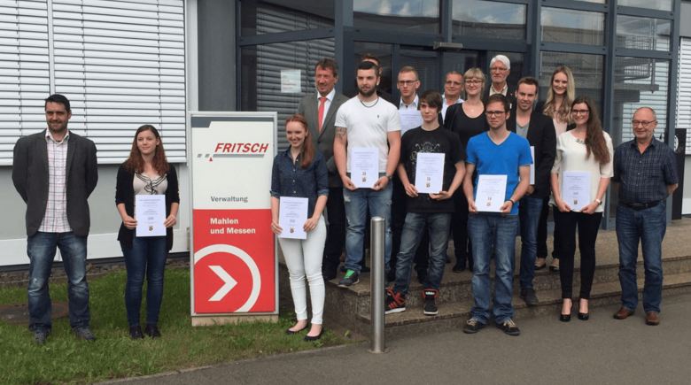 We invited all graduates and teachers for a graduation ceremony to our company headquarters in Idar-Oberstein. Managing director Robert Fritsch emphasized in his welcoming address the relevance of good foreign language skills in a globalized economy. FRITSCH has an export share of 85 % and English skills are tremendously important for our employees. He congratulated all graduates and was happy that also two FRITSCH trainees Selina Krieger and Franziska Mohr were amongst the successful participants. Fred Mildenberger, principal of the vocational school of commerce awarded the vocational students the sought after certificate of the Ministry of Education and Culture (KMK).