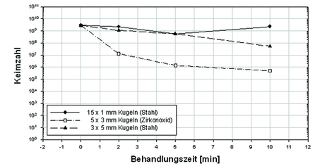 Influence of the grinding process of the Mini-Mill of the recovery rate of B. atrophaeus-endospores in regards to the time and the utilized balls (f=50 Hz) number of bacteria
