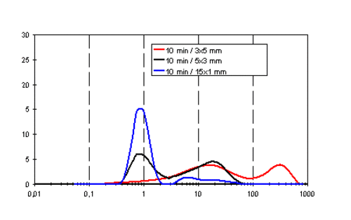 These two diagrams illustrate that the processing with the FRITSCH Mini-Mill PULVERISETTE 23 with the grinding figuration of 15 x 1 mm steel grinding balls and a grinding duration of 10 minutes yields excellent results in the area of the recovery rate of the biological main bacteria B. atrophaeus and the particle distribution of the testing dusts with the B.atropaeus-endospores. Here the degree of the filling of the grinding chamber with 15 x 1 mm grinding balls, which is defined from the ratio of the discharge volume of the idling grinding body discharge, to the volume of the grinding chamber, is very advantageous. This illustrates especially the particle size distribution of diagram 2.