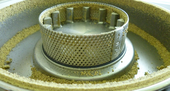| Pictures: | Oily sample uses to block the openings of the used 0,75mm sieve ring rapidly. A grinding of higher amounts is not possible. |