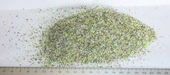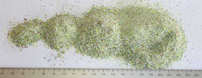 | bis zu 2,5 cm lang und max. 2 mm Dicke; grüne und braune Stückchen PET | |