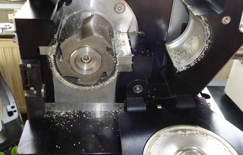 We used a V-cutting rotor and fixed knives made of hardmetal tungsten carbide. This rotor is not as sharp as a V-cutting rotor made of steel (because of a different angle), but shows a much higher durability. For a daily grinding of such small amounts of sample, the standard rotor with V-cutting edges made of tool steel should be suitable. By using a cutting mill, usage of liquid nitrogen is only necessary for a grinding of thermoplastic samples which will start to melt very fast.