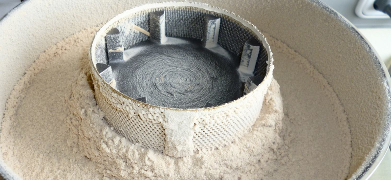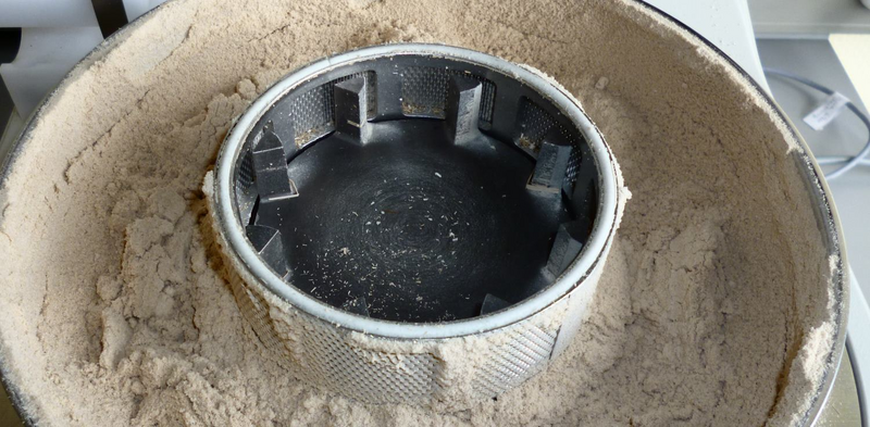 In our second trial, we started grinding with the impact bar and a sieve ring with 0,2 mm trapezoidal perforation. First 15 g of sample have been ground within 55 seconds. Grinding sound use to be smooth, only very small amount of dust escapes the feeding funnel. The remaining 35 g of sample (for a total grinding of 50 g as desired) have been fine directly without a cleaning step in between. After a total grinding time of 2 minutes and 40 seconds, the complete amount of 50 g of sample has been ground.