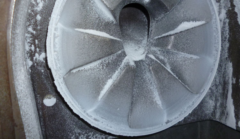 | Pictures: | Opened grinding chamber: a small amount of residue is sticking to the rotors ribs and the outside of the sieve ring. Because no openings are blocked with sample, a grinding of higher amounts is plausible. Also sample use to stick lightly to the collecting pan (by electrostatic charge). |