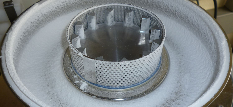 The complete sample amount has been ground within 35 seconds. Afterwards, no openings of the sieve ring are blocked with sample. For a grinding of higher amounts (e.g. 100 g), we recommend using the accessories for grinding large quantities.