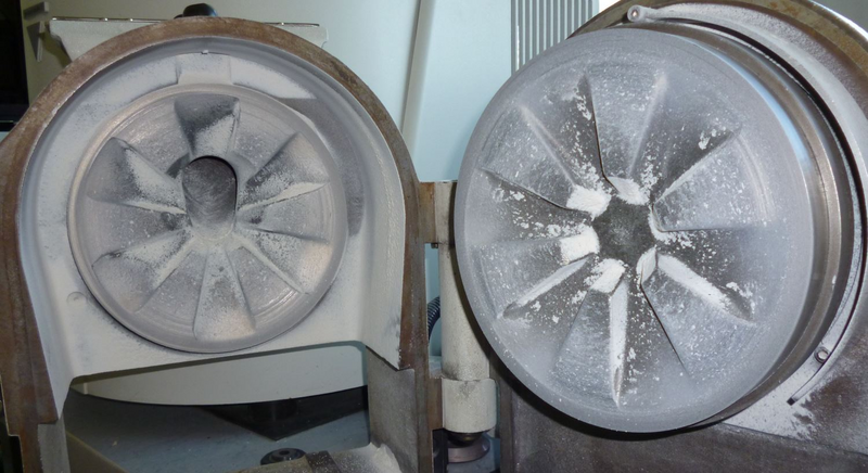 | Opened grinding chamber after grinding. Sample use to be attached by electrostatic charge to the housing. Those kind of sample can be brushed off easily. |
