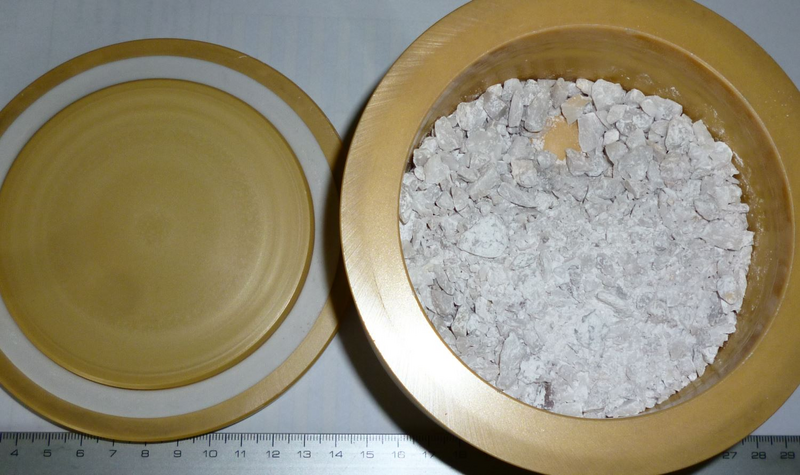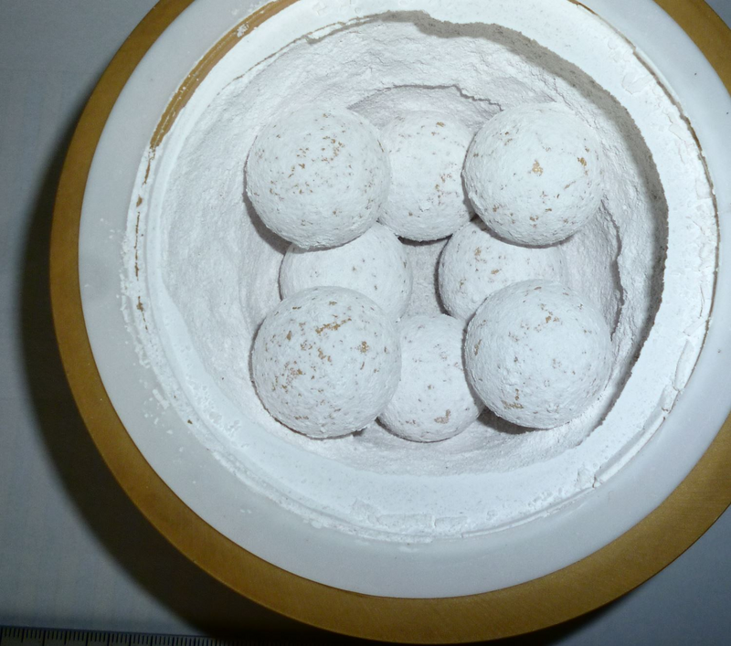 Still particles up to 3-4 mm can be found. For this, a longer dry grinding time is not recommended. A small amount of sample has been taken out for demonstration.