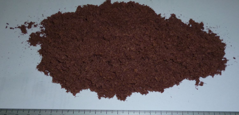 | Pictures: | Leather sample ground with 6 mm square perforated sieve cassette. The sample use to be fluffed, only a few particles are not as fluffy with ~ 5mm length. |
