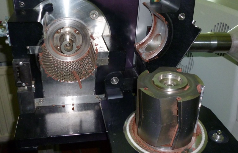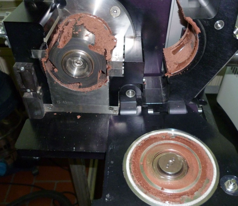 | Opened grinding chamber after 2 minutes. Bit of sample is loose inside the grinding chamber. Higher amounts of residues use to stick to the chamber (hopper and in front of the rotors and the fixed knives). A grinding of much higher amounts is not possible. |