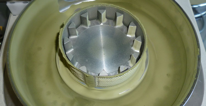 | Pictures: | Almost all openings of the 0,12 mm sieve ring use to be blocked with particles, sample starts melting between impact rotor and sieve ring. |