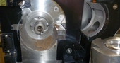 | Pictures: | Opened grinding chamber after 90 seconds: sieve ring and rotor are lightly polluted, a grinding of higher amounts of sample is still possible (with closed standard pan – up to 50 g). |