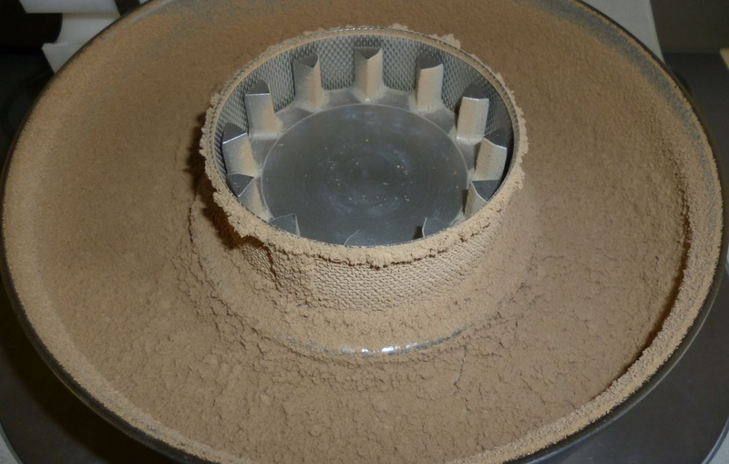 With this setting, rotor and sieve ring are still minimal polluted with fine dust. A grinding of higher amounts is still possible. Also the backside of the rotor is free of higher dust amounts. We are guessing that a grinding of up to 500 g of sample will be possible without problems.