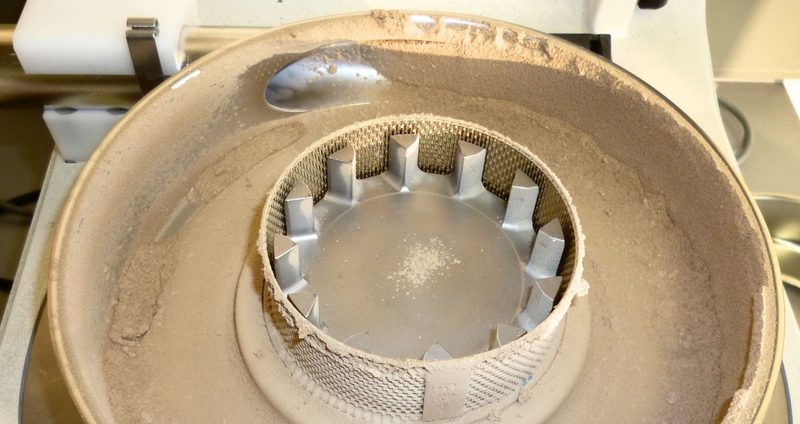 With the cyclone, we achieved an output of 100 g / minute. After ~ 90 seconds, it grinding sound indicates that the majority of sample has been ground. After a total grinding time of 2 minutes, only a minimum residue can be found loose on top of the sieve cassette. A grinding of higher amounts should be possible without any problems.
