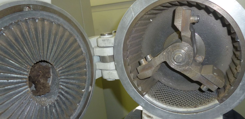 On the left side, you can spot several pieces inside of the feeding funnel. This sample has been ground with result 2a. For the second trial, we only used pieces < 1,5 cm to avoid a jamming. |
