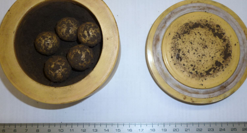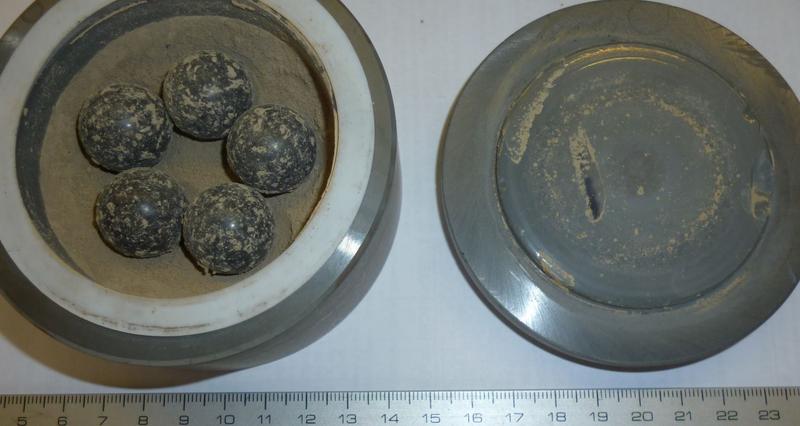| Pictures: | Opened zirconium oxide bowl with 20 mm Ø grinding balls. The soil sample use to stick stronger to bowl and grinding balls as clay did. This might be espoused by higher impact force of zirconium oxide balls (because of its higher density). Also with this trial, no longer dry grinding is possible. Only by grinding in suspension, a better fineness can be achieved. |