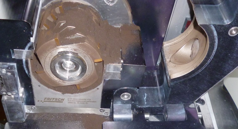 Finest grinding result has been achieved in our last trial with Cross Beater Mill PULVERISETTE 16 and a bottom sieve of 0,2 mm trapezoidal perforation. Like result 3, we placed a vacuum cleaner next to the opening of the feeding funnel to avoid dust exploration.
