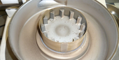 | Opened grinding chamber: several grams of particles stick to the collecting pan. Impact rotor is only lightly polluted, sample dust starts to build up on the outside of the 0,12 mm sieve ring. |