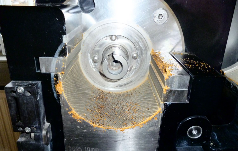 In our last trial, we used a 0,25 mm sieve ring instead of a sieve ring with 0,5 mm trapezoidal perforation. For been save, we reduced feeding speed to hinder a blockage of sample in front of the sieve ring. It took about 350 seconds until all sample has been fed.