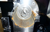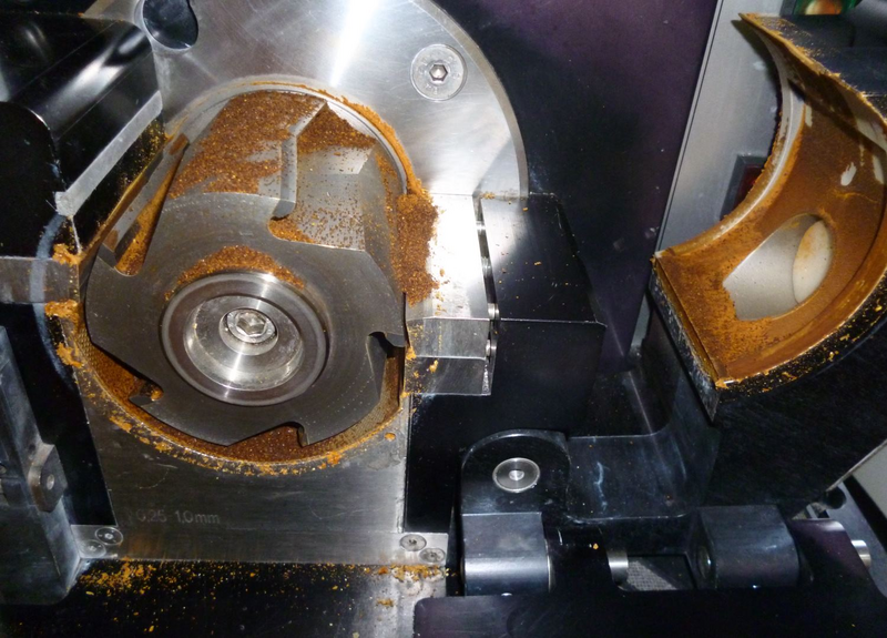 | Opened grinding chamber after 1 minute. Only in front of the first fixed knife, a bit of residue uses to remain. Cleaning can be performed rapidly by vacuuming with a soft brush. A grinding of higher amounts of sample is still possible. |