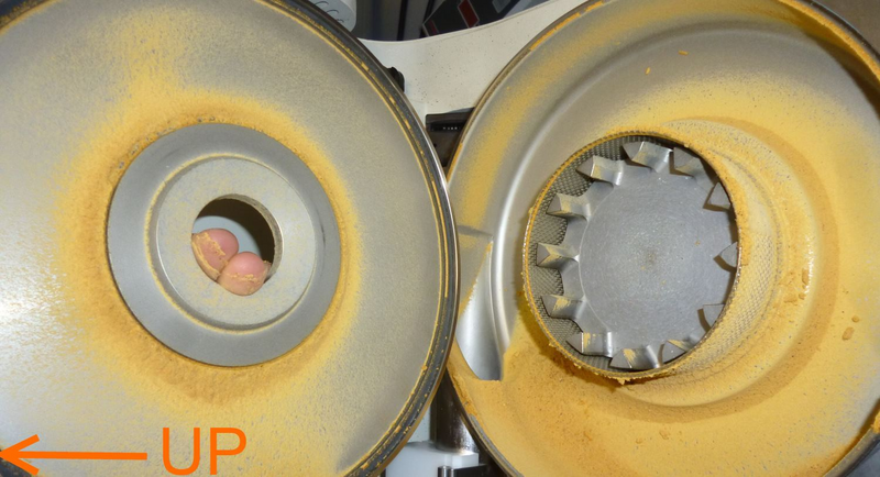 | Pictures: | Opened grinding chamber after a total grinding time of 5 minutes. Still a lot of sample use to remain inside the grinding chamber. A lot of openings of the sieve cassette use to be blocked with sample. Sample is sticking in front of the knives and where the funnel use to guide sample into the grinding chamber. |