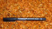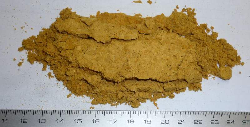 Original start size of sample: (pen has been added for comparison); the sample use to contain small brown seeds with ~ 3 mm length and soft orange-yellowish blossom or leafs with up to 2 cm max. length. |