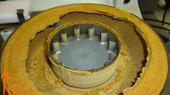 After grinding, it has shown that fine ground sample material uses to stick to the collecting pan and to the outside of the sieve ring. Almost ½ of the openings of the sieve ring are already blocked with small sample particles.