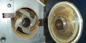 | Opened grinding chamber after 60 seconds of grinding. Loose sample use to remain mainly on top of the first fixed knife where the standard funnel will enter the grinding chamber. Most of the sample on top of the sieve insert can be vacuumed off. Also the rotor can be removed easily by sliding off of its coil when a cleaning step will become necessary. |