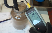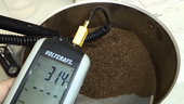 We placed the sample overnight into a fridge with – 18°C. Next day, sample has been taken out and brought into our laboratory. With a standard contact thermometer, a sample temperature of – 9,4 °C has been detected inside the heap of wood chips.
