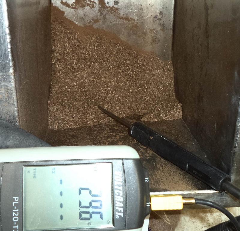 The ~ 250 grams of wood chips got ground within 40 seconds. Afterwards, temperature of resulting particles has been checked again. Our thermometer has shown a maximum temperature of 18,7 °C which was -1,9 °C below actual room temperature.