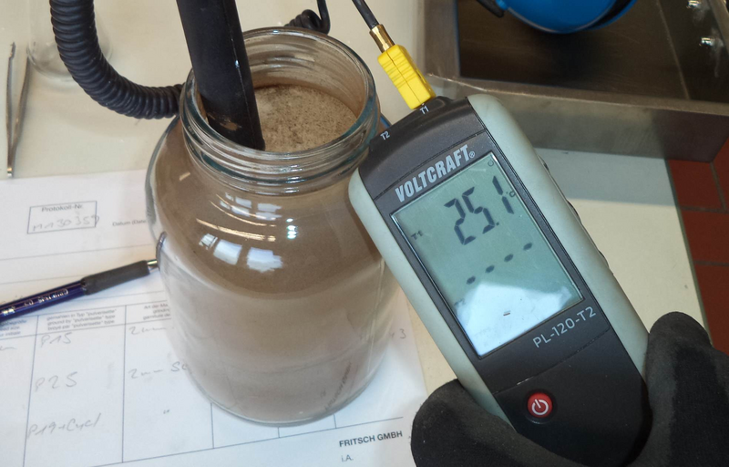 Ground sample in collecting vessel. The temperature directly after grinding rose up to 31,4 °C. |