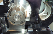 | Opened grinding chamber: sieve cassette, lid and rotor are still in position, some flat particles use to lie loose on top of the sieve cassette and will not get grabbed by the rotor anymore. Cleaning can be performed rapidly by vacuuming with a soft brush. |