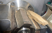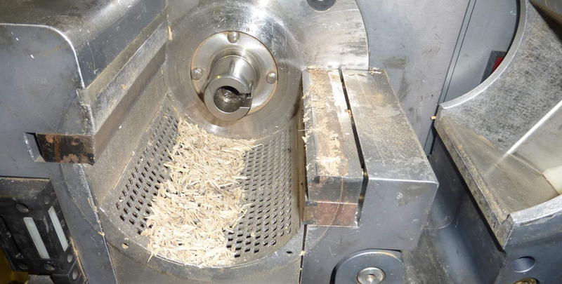We interrupted the grinding process, because the largest fed piece of ~ 14 cm used to jam the protected hopper (see additional photo page). This piece got removed and has been fed a second time to the hopper, so this piece got fed in a different direction again and got ground properly. Pre cutting (e.g. with a band saw) of pieces > 10 cm might be recommended be on the save side, so all pieces will get grabbed properly.