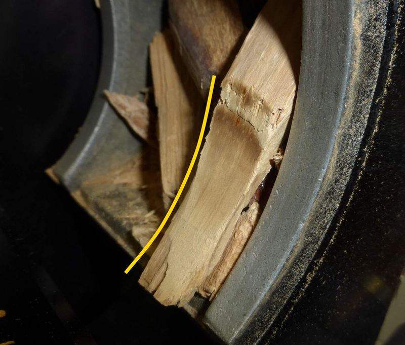 With the properly filled feeding funnel, one of the larger pieces jammed the opening while it was lying in front of the rotor without getting grabbed. With the yellow line, it is marked how the rotor was scratching over its surface, only removing small layers. With less sample inside the hopper, the sample pusher can be used to support feeding; for this, we only recommend to feed such large particles in batches of smaller quantities to the hopper. |