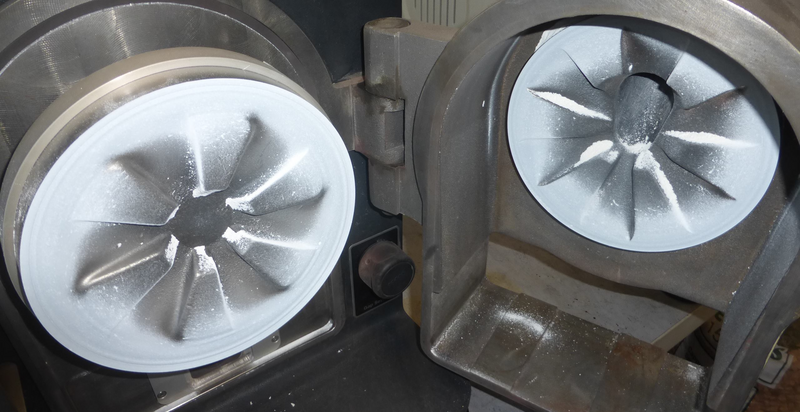 Test wise, we used the Disk Mill PULVERISETTE 13 and ground a sample amount of 125 grams with 0,05 mm gap setting. Surely also other grinding disks (e.g. zirconium oxide as desired) can be used for comminution. After feeding of the sample, the typical grinding sound vanished within 20 seconds. Typically about 10 ± 3 grams of sample remains loose inside the grinding chamber afterwards. Also here, a few grams remained, easily to remove by vacuuming with a soft brush.