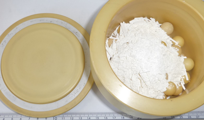 Without knowing the properties of sample, we reduced the main disk speed of the mill to only 450 rpm to check grinding behavior. After only one minute of comminution, the sample was compressed harder to grinding bowl and balls. A longer dry grinding is not recommended.