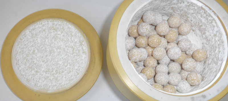| Pictures: | 100g of sample filled into a 500 ml bowl made of ZrO2 with 70x 15 mm grinding balls before grinding |