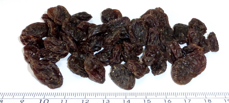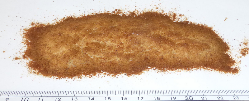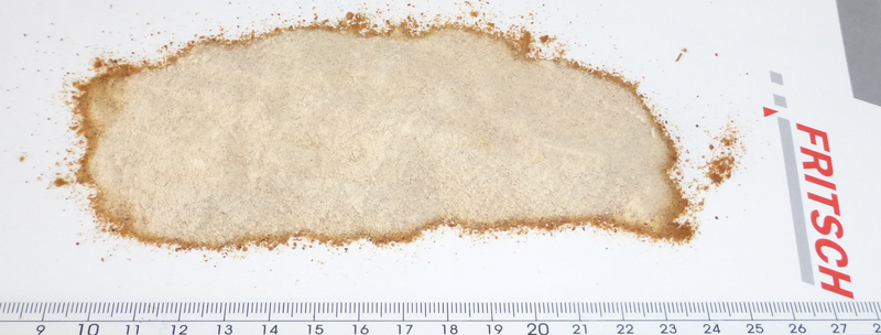 The mill was set to comminute in intervals of 10 seconds at maximum speed. The grinding sound vanished after the third interval was started. So grinding was interrupted after a total grinding time of 30 seconds and the ground sample material was poured out onto a sheet of paper. The still frozen sample started to melting directly where contact to the paper sheet was present. A majority of the raisins was comminuted to a fine powder. Some fragments with a length of ~ 500 µm were spotted inside the heap.