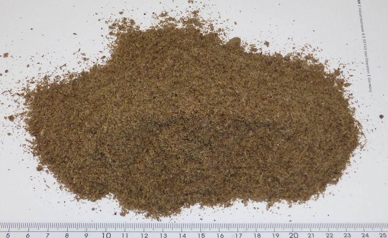 | Opened grinding chamber after pre grinding of 220 g crickets with 4 mm square perforated sieve ring. |