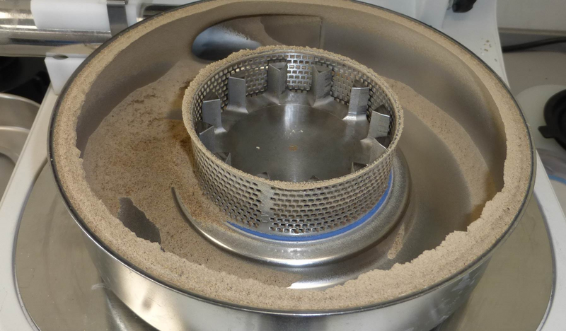 For the fine grinding of sample, we used a 2 mm square perforated sieve ring. The 150 gram batch was fed into the mill within 110 seconds.