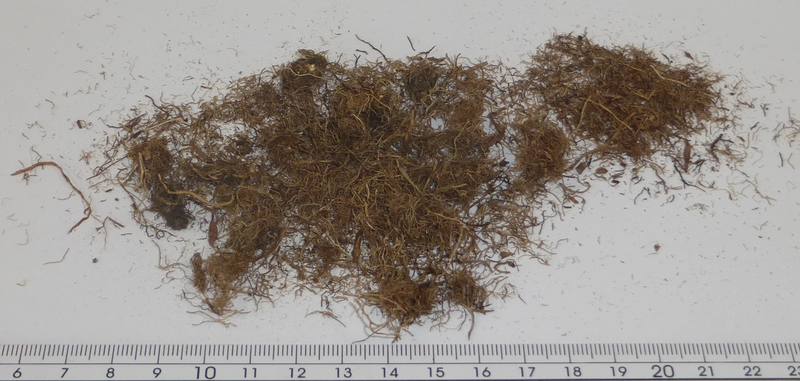 Large, interlocked root fragments were quickly precut with a classic scissors before the root fragments were fed. Afterwards, the sample pieces (mostly < 10 mm) were fed and ground within 15 seconds only. The grinding sound was indicating that the roots were not brittle enough to be ground by impact forces. Shearing off, between rotor and sieve ring was the main comminuting principle for this sample.