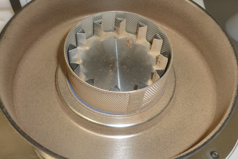 The grinding sound almost vanished instantly, after the last fragment was fed. We were able to brush out about 0,6 grams of ground sample material. Only a bit of fine sample dust was located below the rotor (between the first two channels of the labyrinth disk).