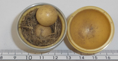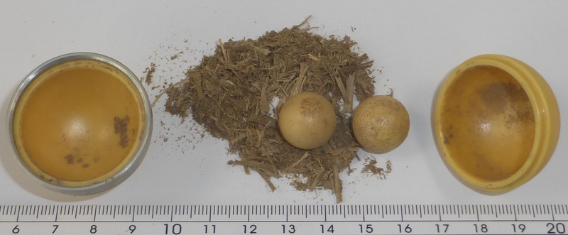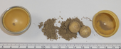 | Pictures: | 0,5 grams of original sample, next to the bowl (equipped with 2x 15 mm Ø grinding balls). |