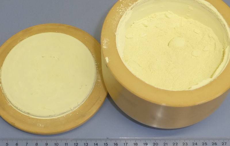 We proceeded dry grinding for two further minutes (3 minutes of total grinding time) and found, that the sulfur already got compressed much harder to grinding balls and the bowl as well. A longer dry grinding is not possible anymore.