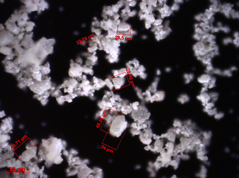 | After 15 minutes of grinding, a small portion of sample was taken out for optical microscopy. Majority of formed particles was comminuted < 35 µm as desired. |