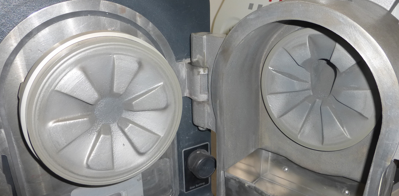 | Opened grinding chamber after 20 seconds of 0,5 mm grinding, followed by 10 seconds with 0,2 mm gap setting. Few residues were removed by vacuuming with a soft brush. |