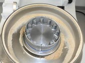 | Opened grinding chamber after 50 seconds: used sieve ring and impact rotor are mainly free of residues. Surely higher amounts of embrittled sample can be ground per batch. |