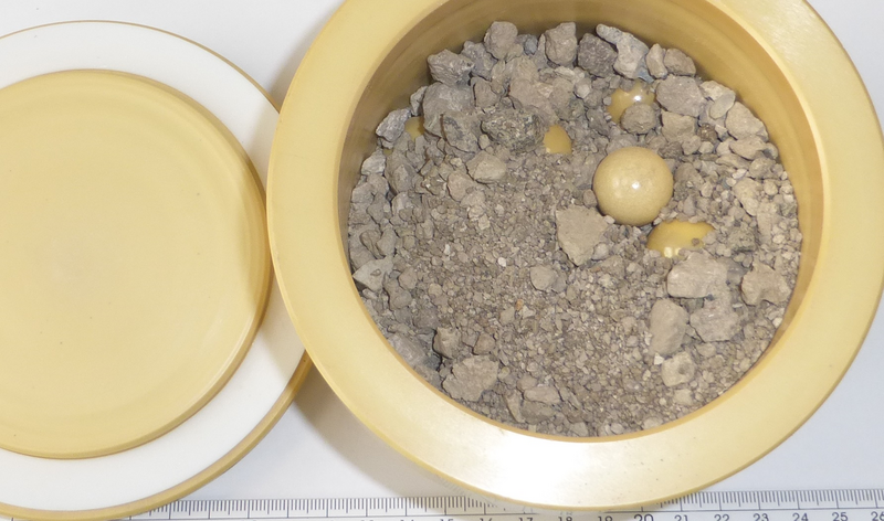 We started our first trial with sample ATR-1 ( and desired Planetary Mill PULVERISETTE 5 classic line. The present agglomerates (up to ~1 cm diameter and harder) required a pre crushing with 20 mm Ø grinding balls. Therefore, we started our trial with 130 g of ATR-1 sample and 25x 20 mm Ø grinding balls as a first step of comminution. After the first minute, sample started sticking already.