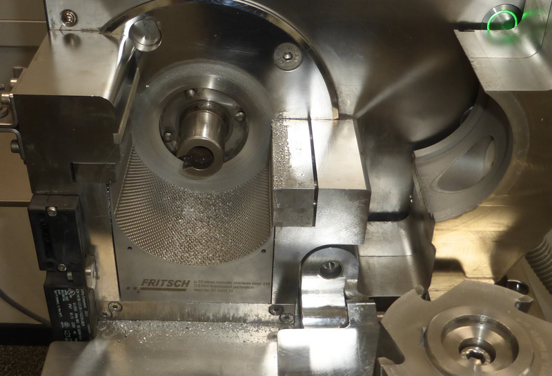 For this test, we used our Steel Universal Cutting Mill PULVERISETTE 19 with 400 V current and 3000 rpm fixed speed. We used the disk milling rotor with indexable inserts and knives made of hardmetal tungsten carbide for comminution (recommended when metal fragments should be cut). Only with this rotor, hardmetal knives can be exchanged on the customer side.