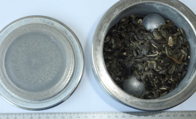 | Pictures: | 500ml steel bowl with 30 mm grinding balls; 100 grams of sunflower seeds – before grinding. |