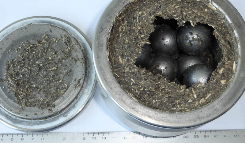 We interrupted the grinding process after one minute. As expected, the balls were located in the middle of the grinding bowl. The sunflower seeds were ground into a mushy consistency, dry enough to stick to the grinding bowl. The grinding balls were coated in oil, the surface was much smoother compared to starting conditions.